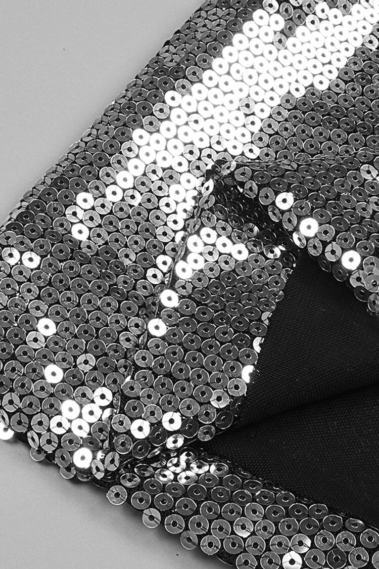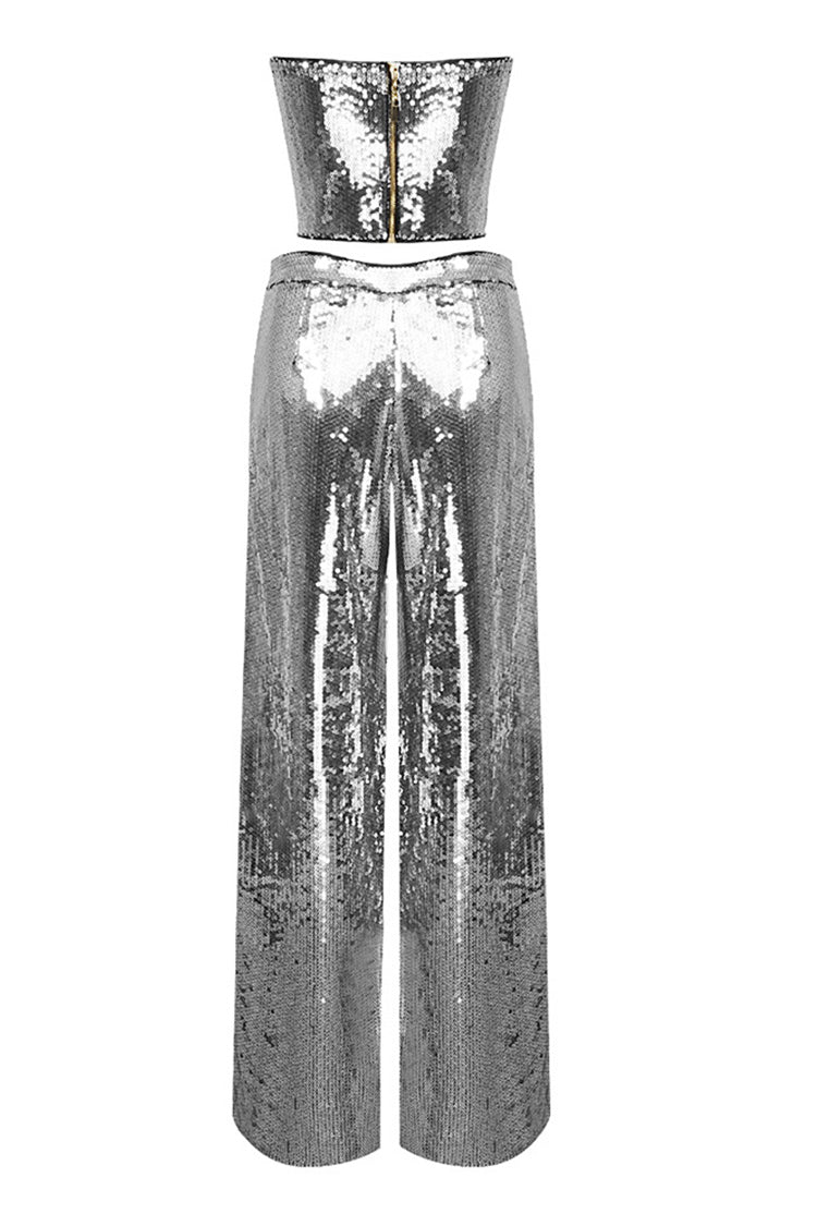 Dazzle the crowd in our boutique's sexy sequin matching sets! This daring strapless top boasts a sweetheart neckline and a figure-hugging bustier bandeau. cinched perfectly with a rear zipper. The V-shaped low waistline of the top completed the high waist pants create a cool-girl silhouette for women. Full-length and slightly flared. the matching pants add drama to your stride. complete with a button closure and two side slip pockets. Completely covered in glitter sequins. this metallic two piece set is perfect for any party and club scene. Slip into it and enter the enchanting disco nights!