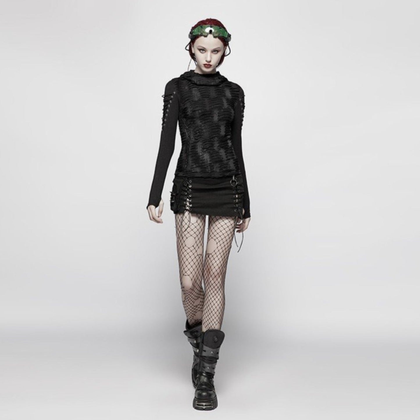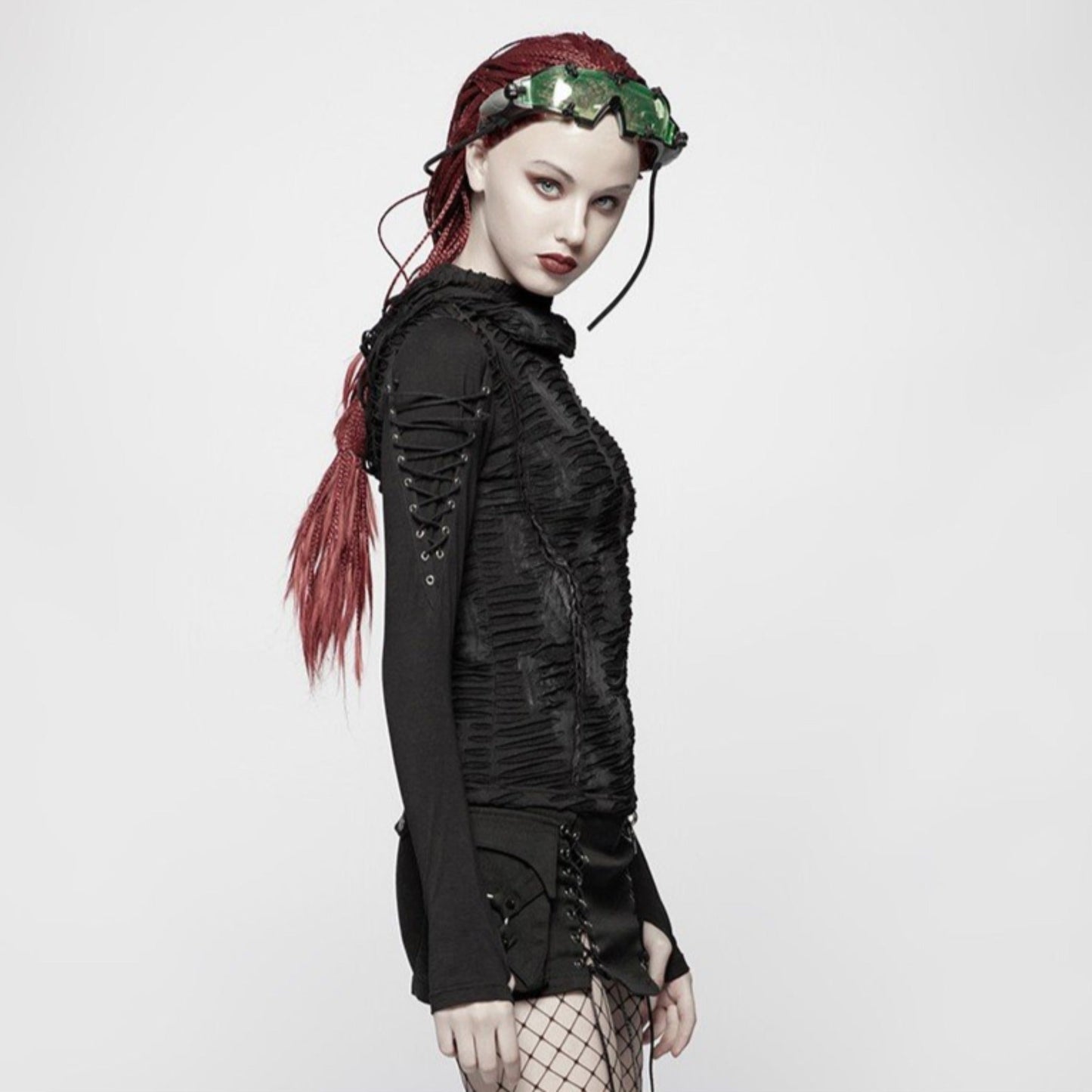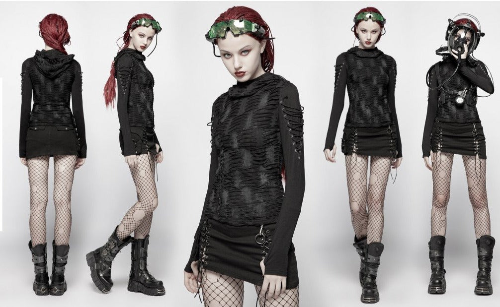 A superbly textured long sleeved top with a large hood. front cowl neck and draped sleeves with thumb loops. Faux distressed marks give grimy steampunk vibes!
