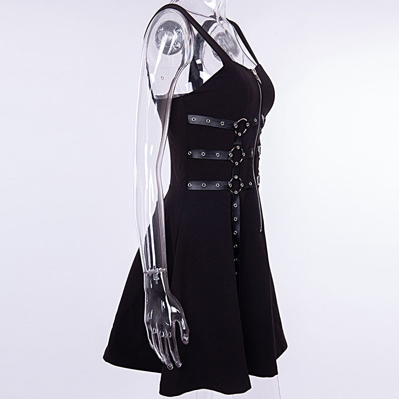 The alluring design features three rows of straps with two long vertical pieces with metal ring connectors. A cute zipper runs all the way up the top of the dress into the flattering bustier top and two thick spaghetti straps hold you up securely.
