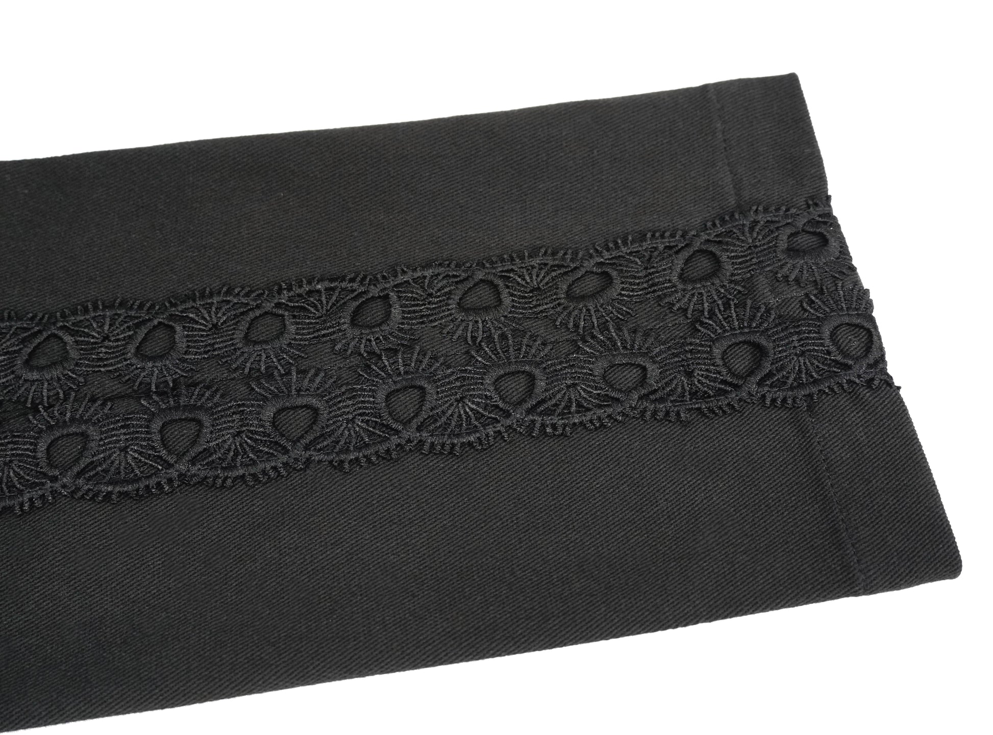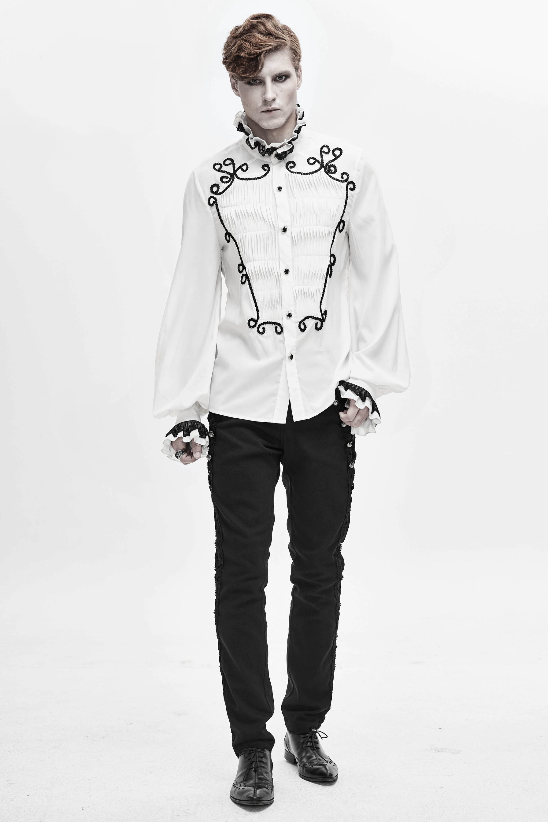 Ornate and stylish. Vampire style slim-fit trousers with uniquely embellished and velvet laced side panels. plus an ornamental buckle on the back.
