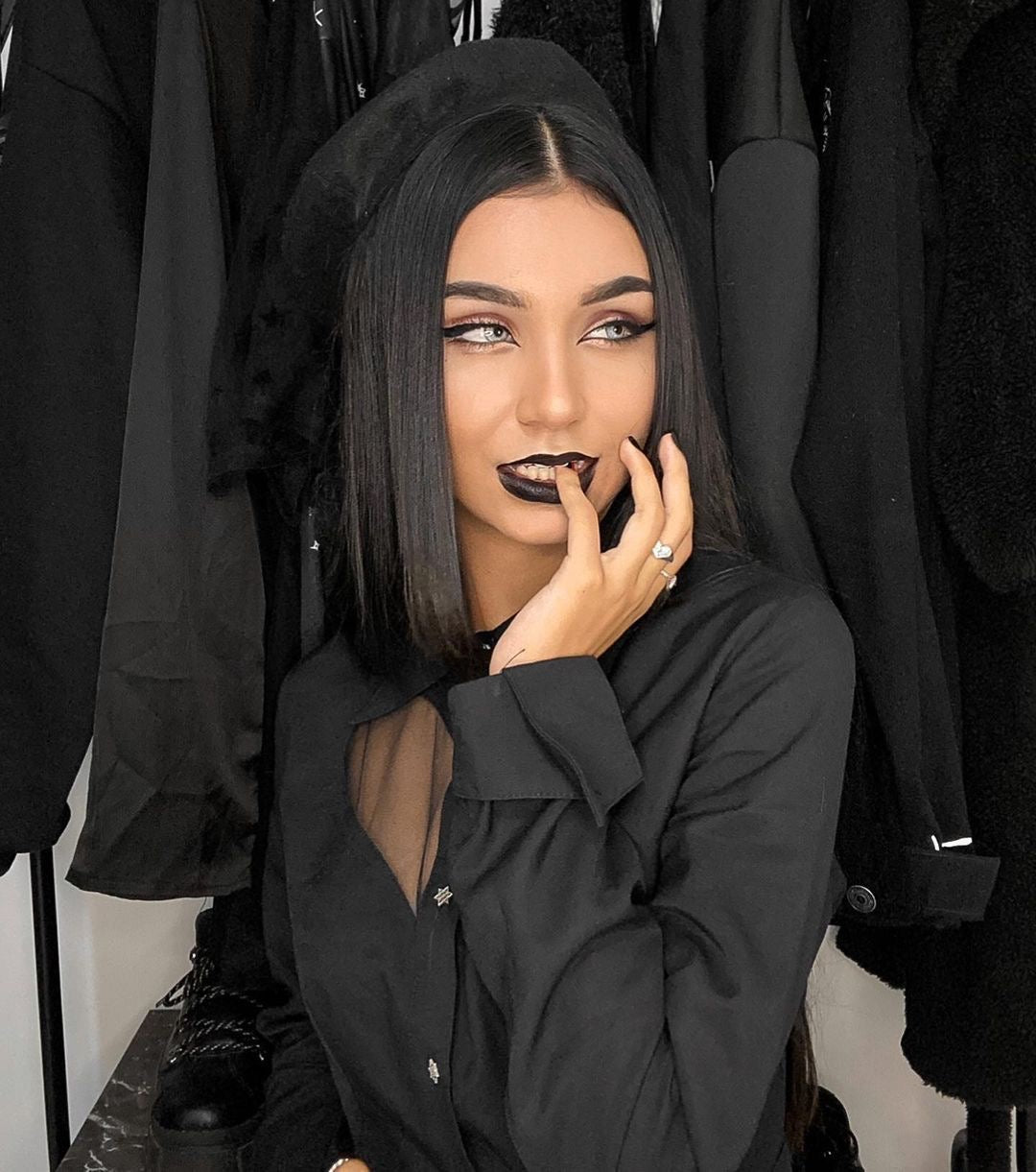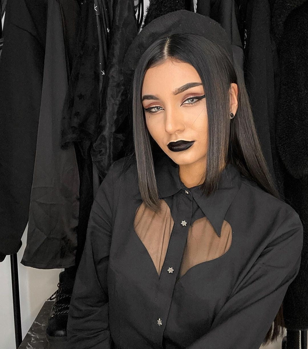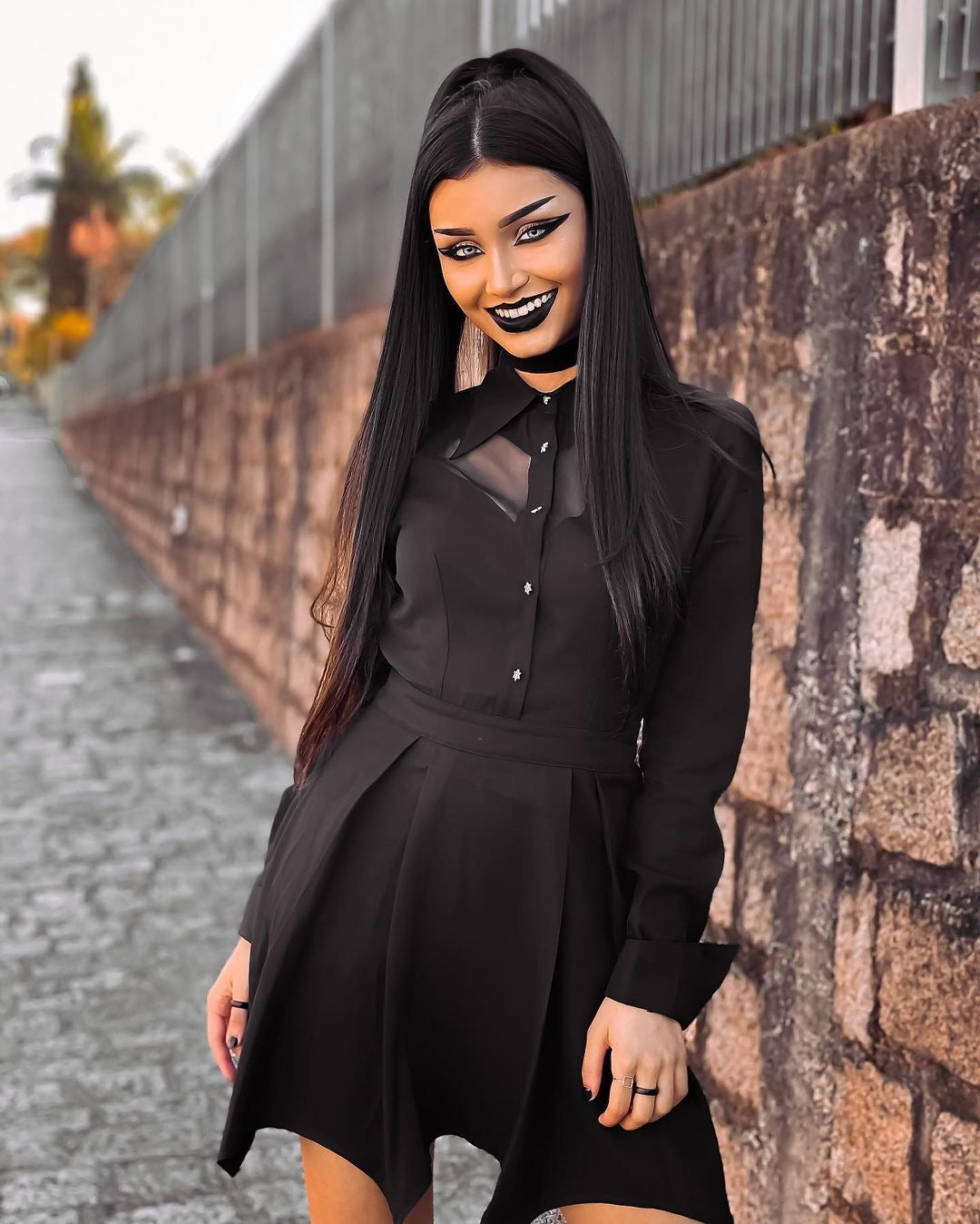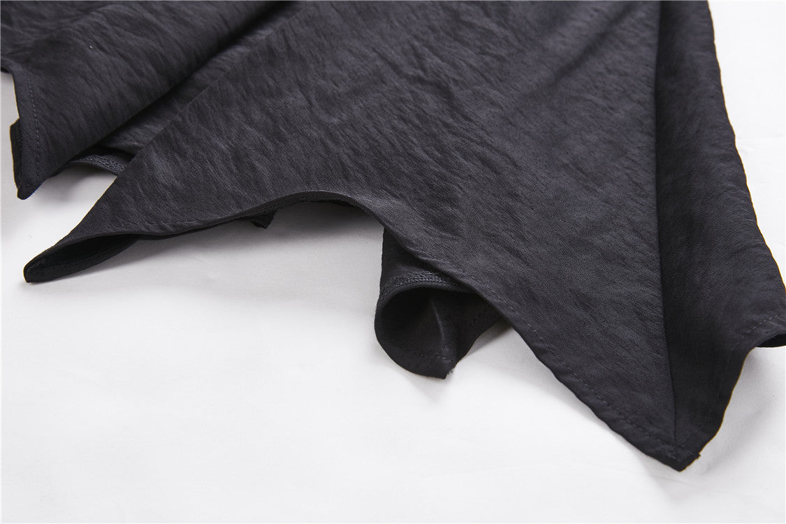 The ultimate bat-style Goth mini dress with a sheer heart cut-out chest design and the coolest pointy cuffs. collar and hem.