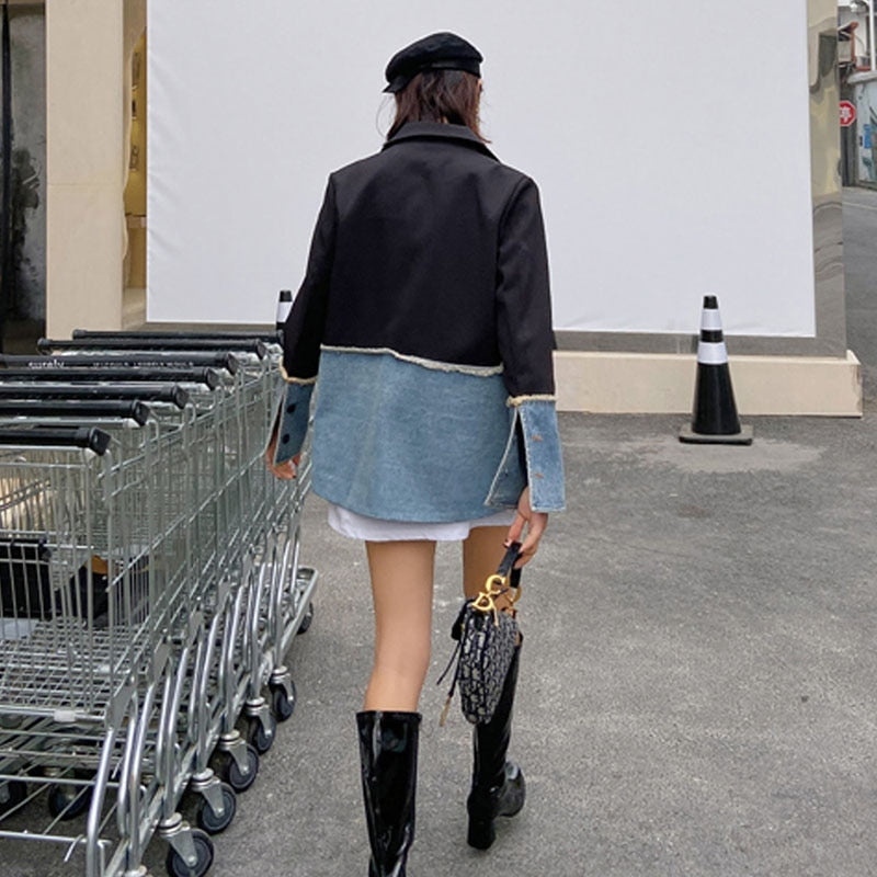 Polyester Patchwork Pockets and Spliced Decoration Turn-Down Collar Blazer