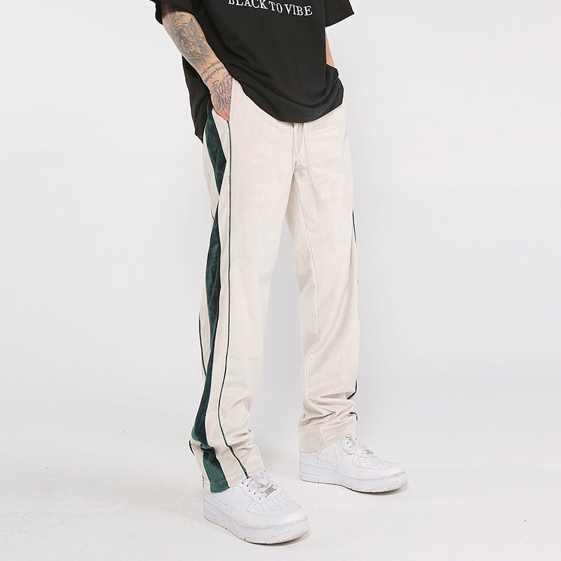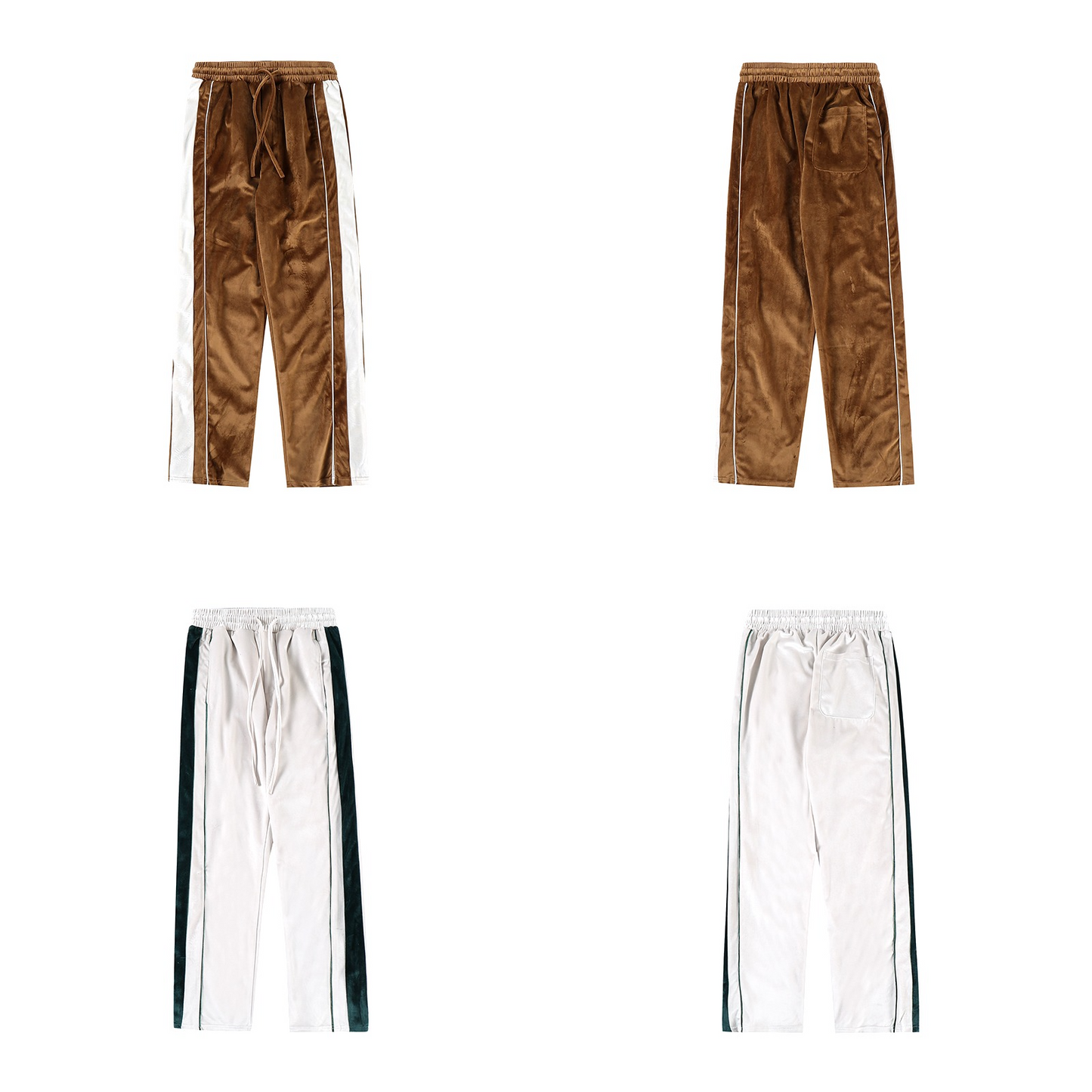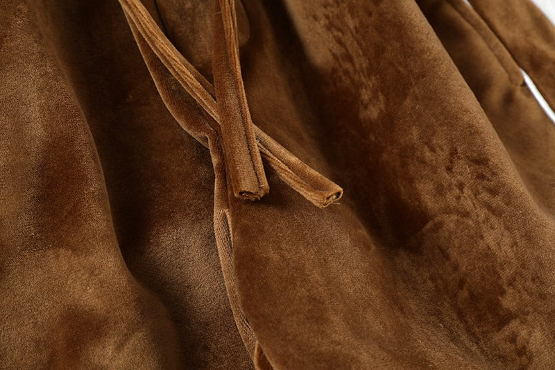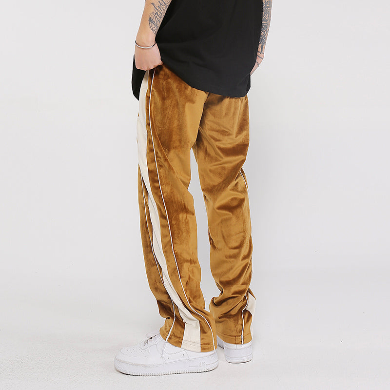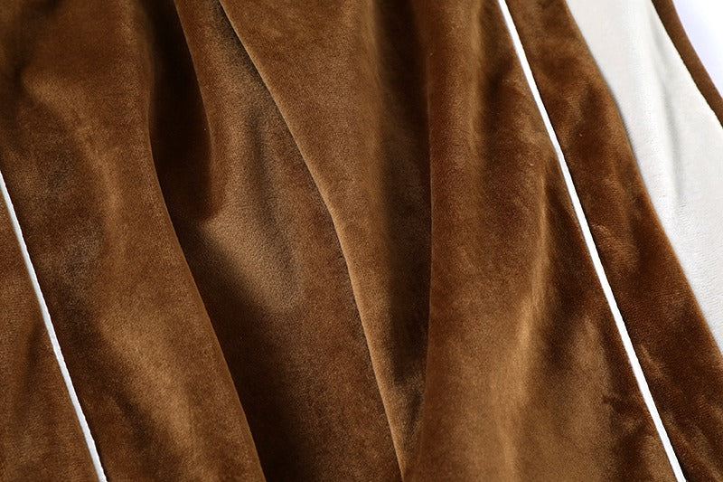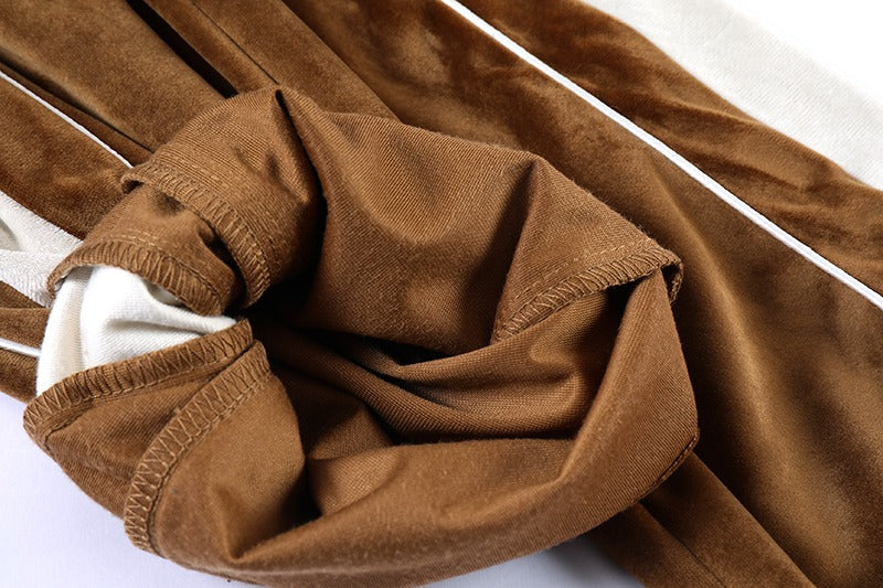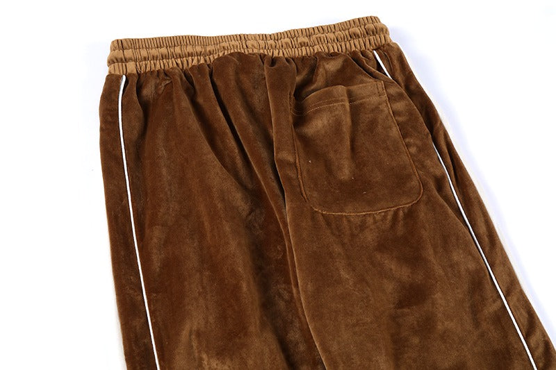 Luxurious brown velour pants with white side stripes. These track-style pants feature an elastic waistband with drawstring for a comfortable fit. The soft. plush texture of the velour material gives a rich look. while the contrasting white stripes add a sporty touch. Perfect for a relaxed. yet stylish casual outfit.