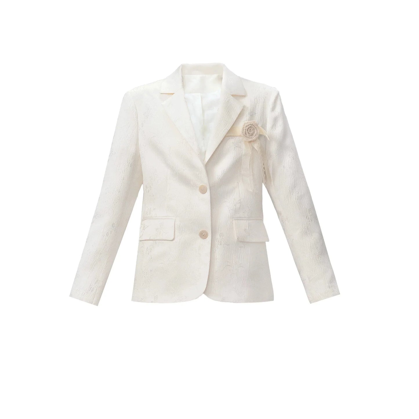 This tailored blazer is a versatile addition to your wardrobe. Available in ivory with a delicate floral brooch or black with a chic chain accent. it offers a touch of elegance and sophistication. Ideal for both professional and social settings. it is a must-have for any fashion-forward individual.