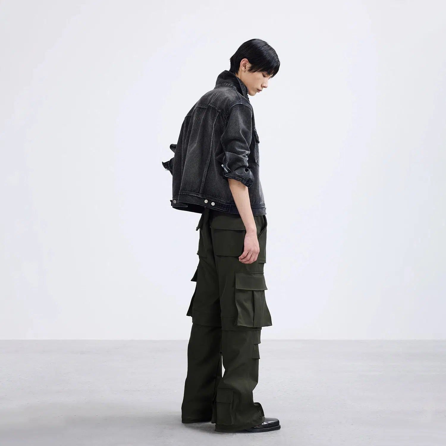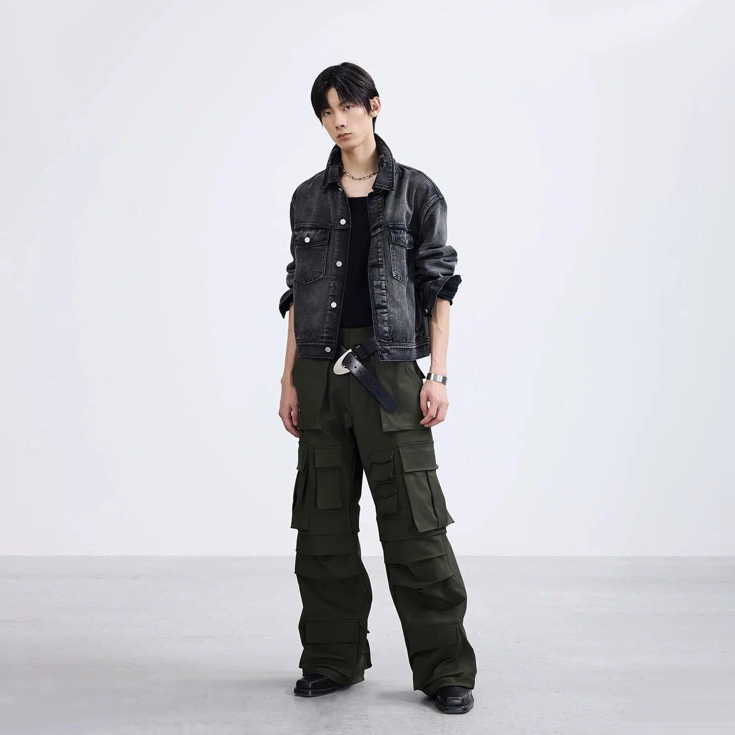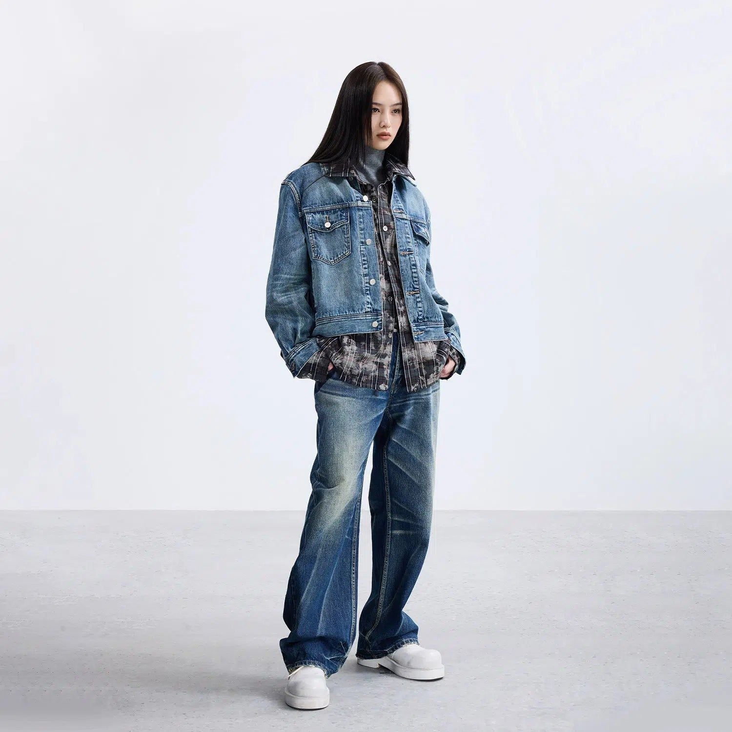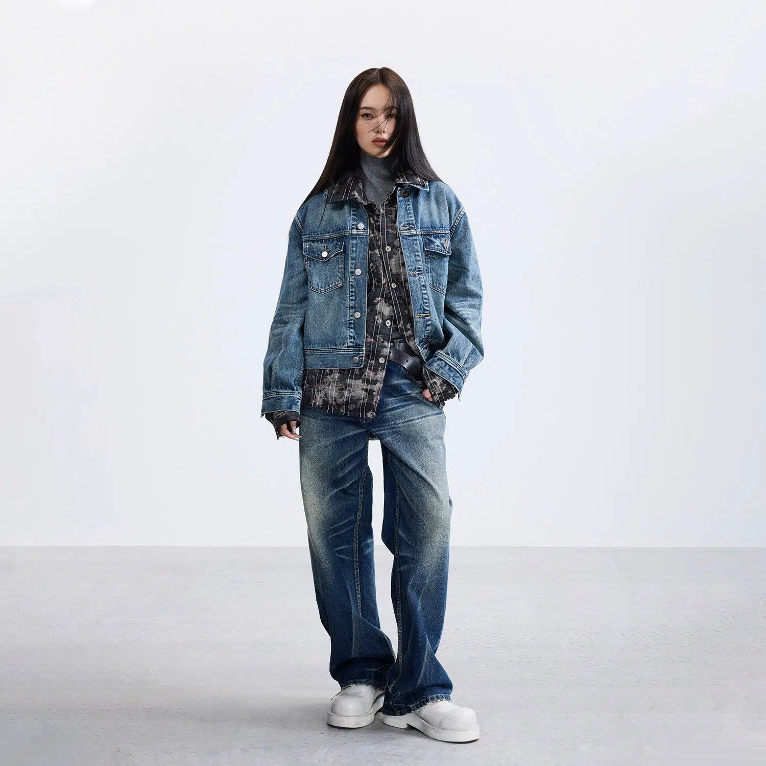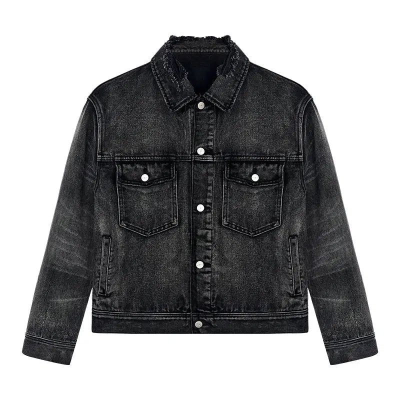 Classic black denim jacket with a worn-in look. Features a button-up front. collar. and two chest pockets with snap closures. Side pockets and adjustable waist tabs add functionality. The distressed finish gives it an edgy. vintage appeal. Perfect for layering and adding a cool. casual vibe to any outfit.