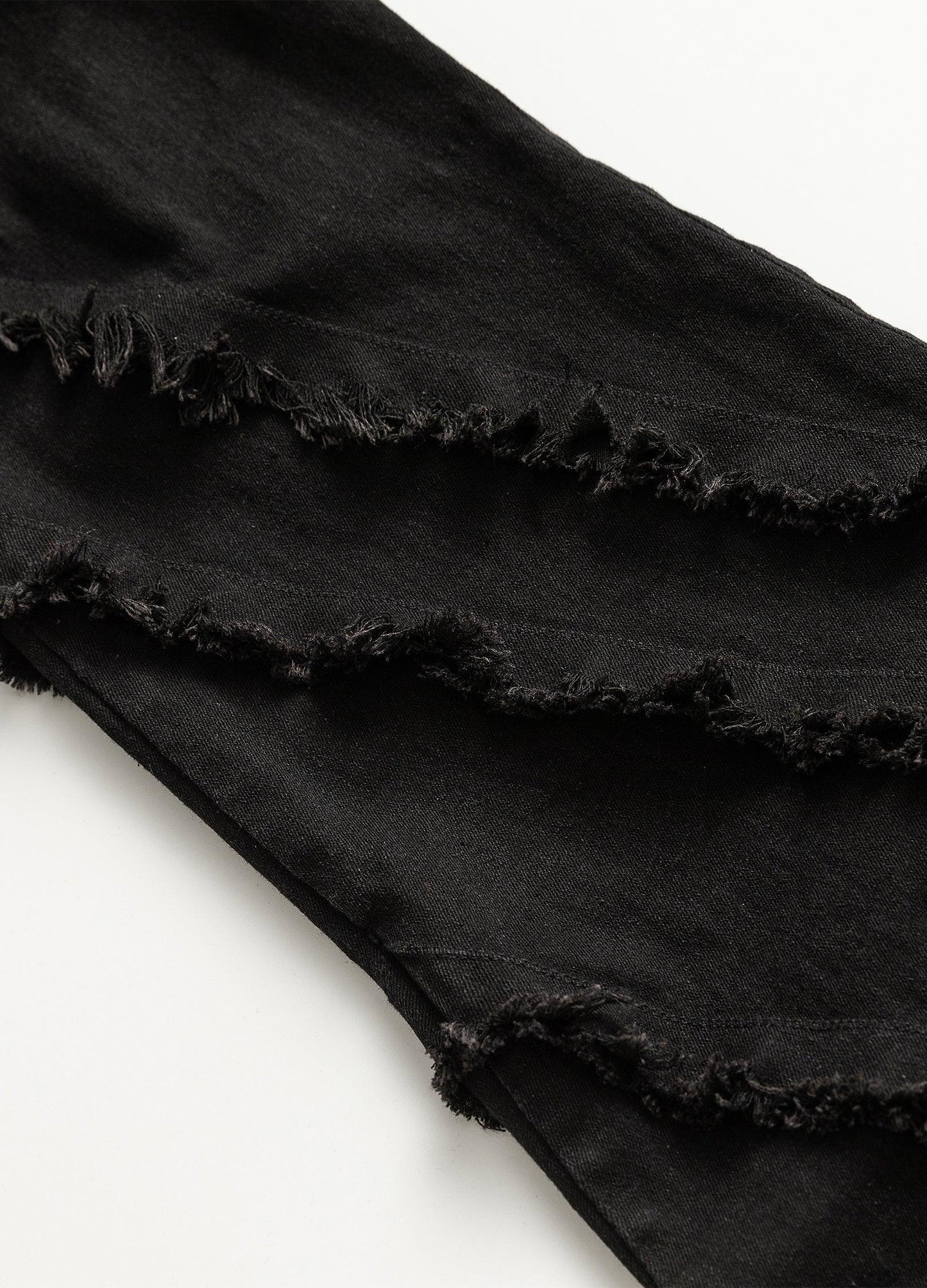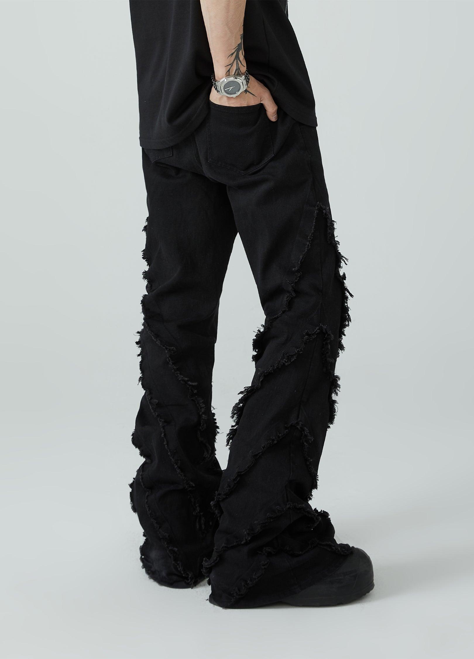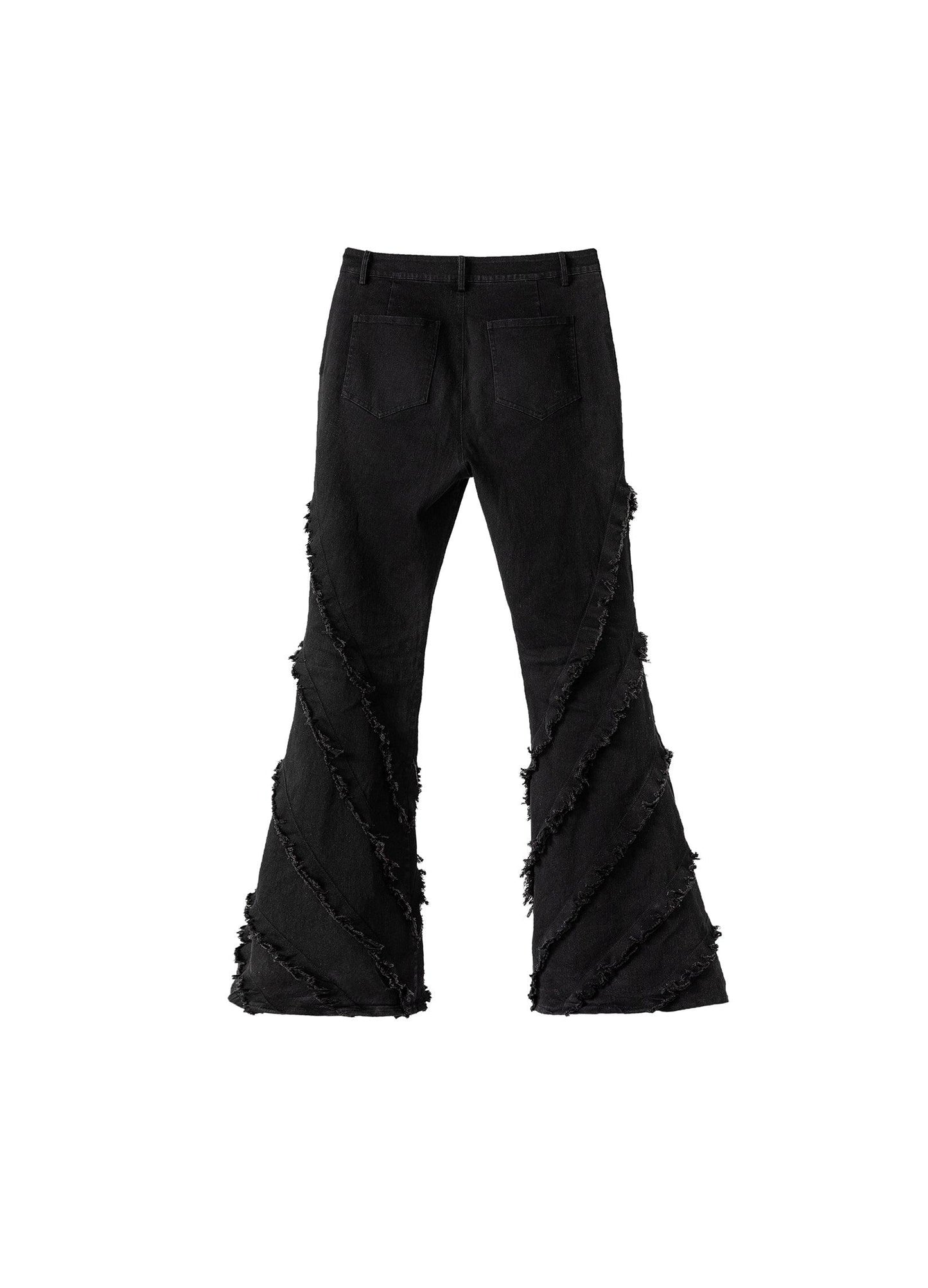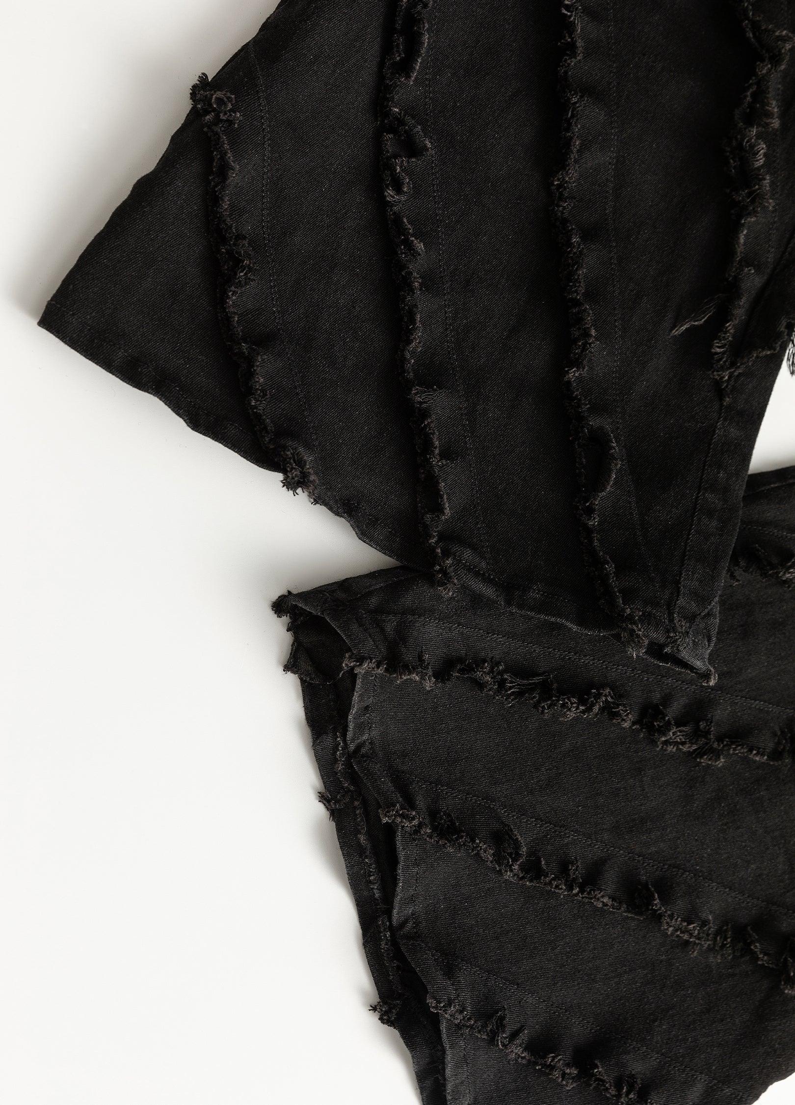 Vintage Black Flared Denim Trousers - these stylish and comfortable trousers feature a micro flared cut and distressing trim details. Made from a washed denim fabric. they offer front and back pockets and a slight stretch for a perfect fit. This unisex item is crafted from a blend of Spandex. cotton. and polyester. Available in sizes Small. Medium. Large. and Extra Large. Model (175cm) is wearing a size Medium.