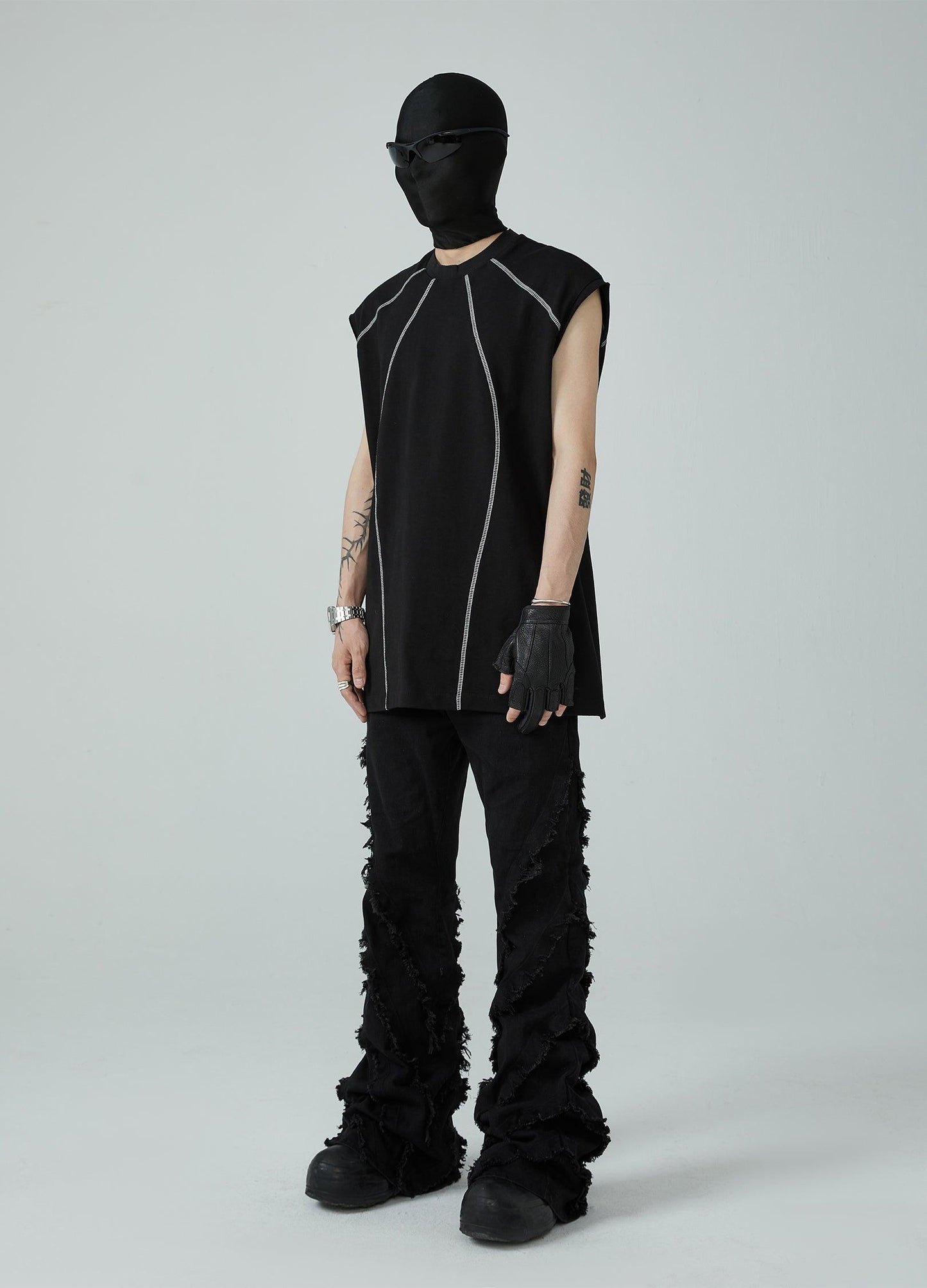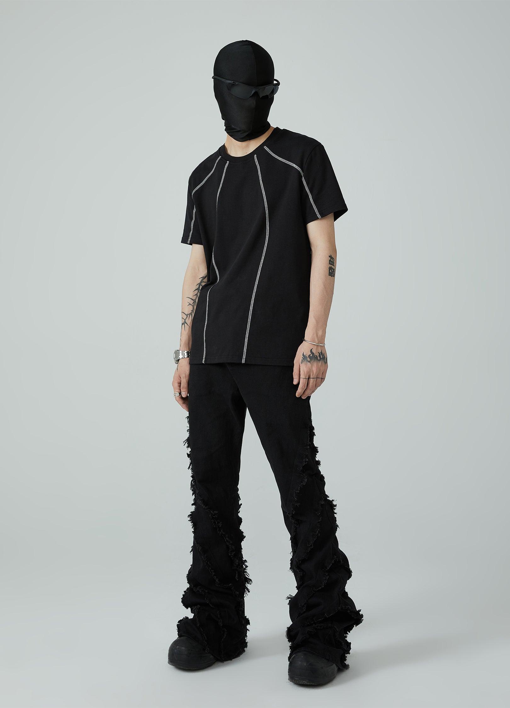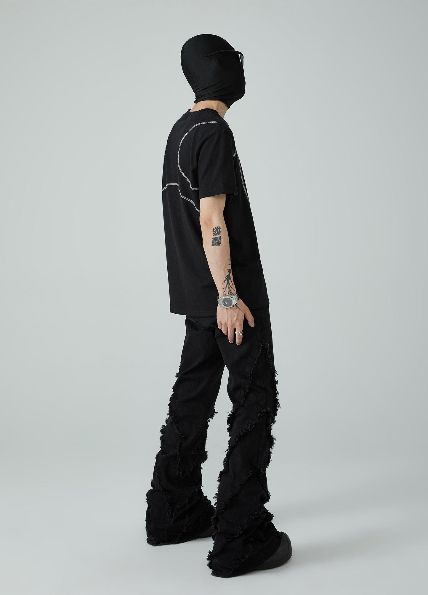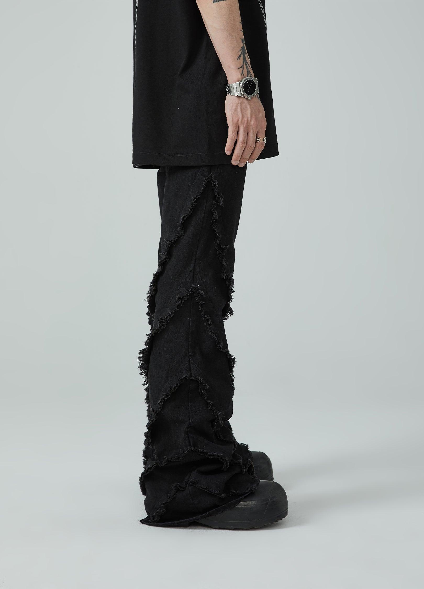 Vintage Black Flared Denim Trousers - these stylish and comfortable trousers feature a micro flared cut and distressing trim details. Made from a washed denim fabric. they offer front and back pockets and a slight stretch for a perfect fit. This unisex item is crafted from a blend of Spandex. cotton. and polyester. Available in sizes Small. Medium. Large. and Extra Large. Model (175cm) is wearing a size Medium.