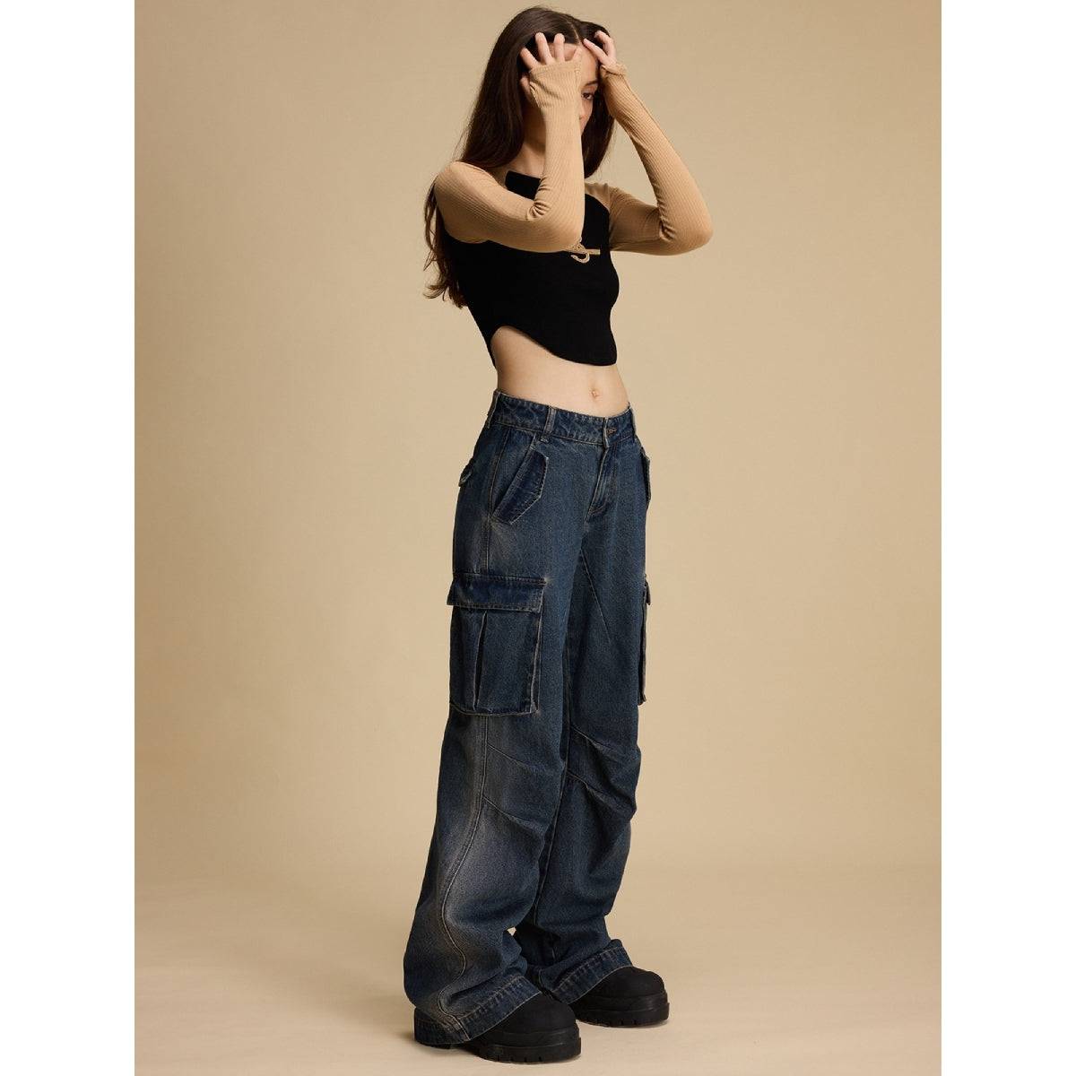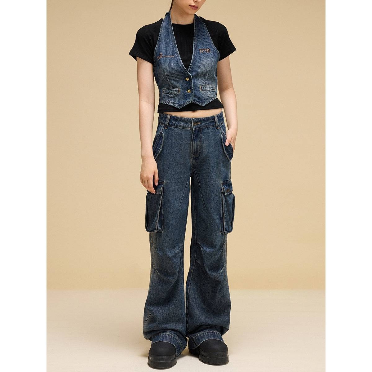 Vintage Blue Wide-Leg Cargo Denim Jeans