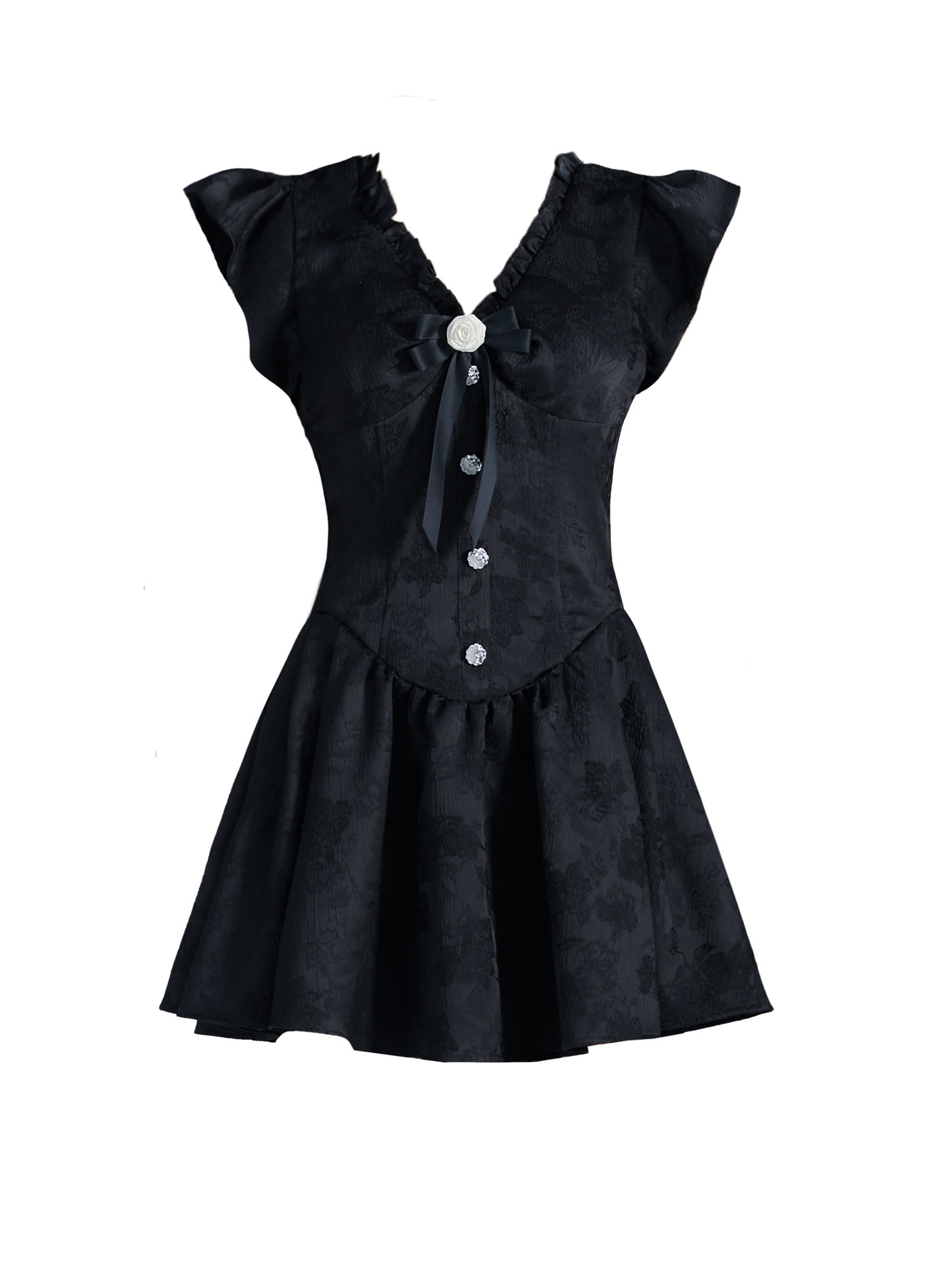 Vintage-Inspired Black Flutter Sleeve Mini Dress with Button Front