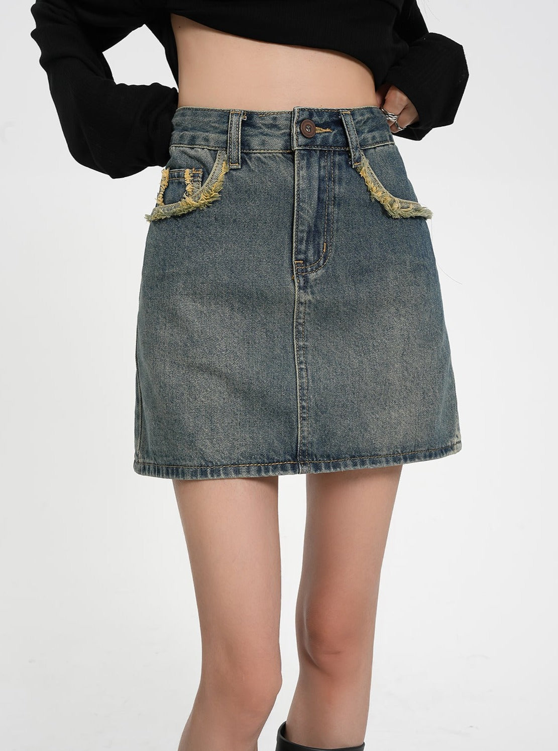 Vintage-Inspired Denim Mini Skirt - Two-Tone Patchwork Jean Skirt with Raw Hem