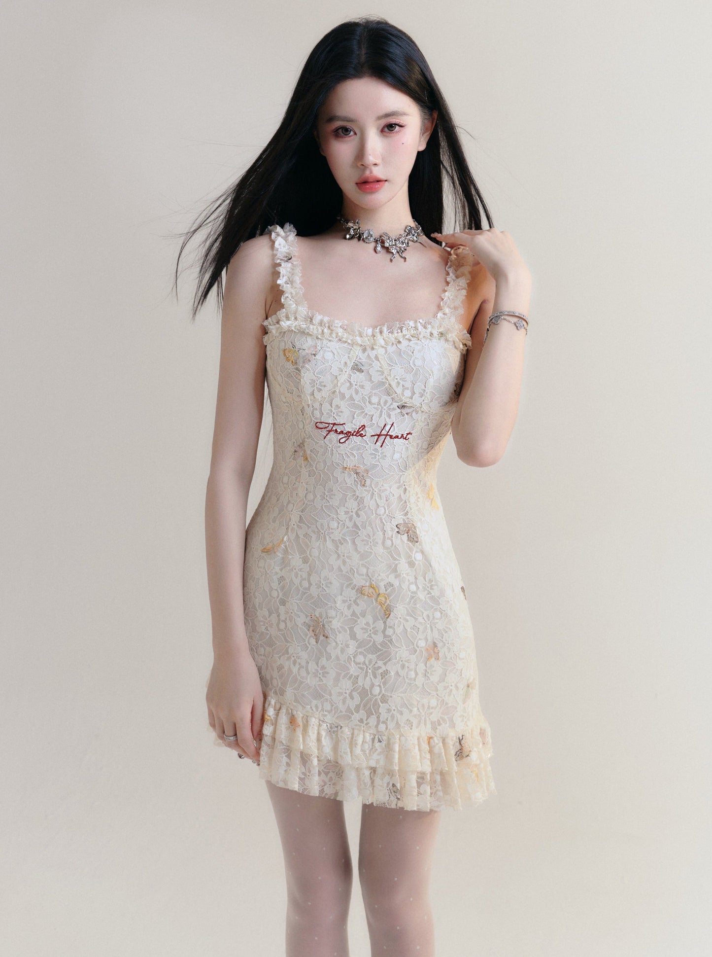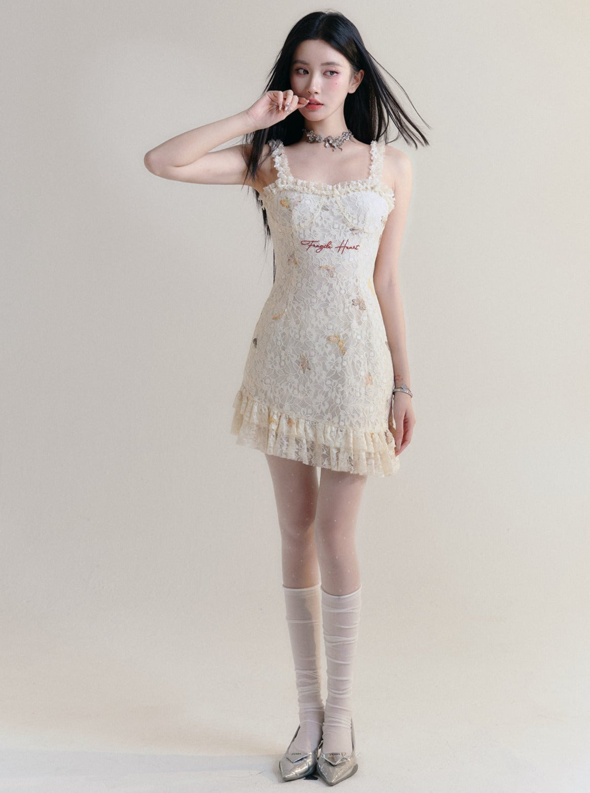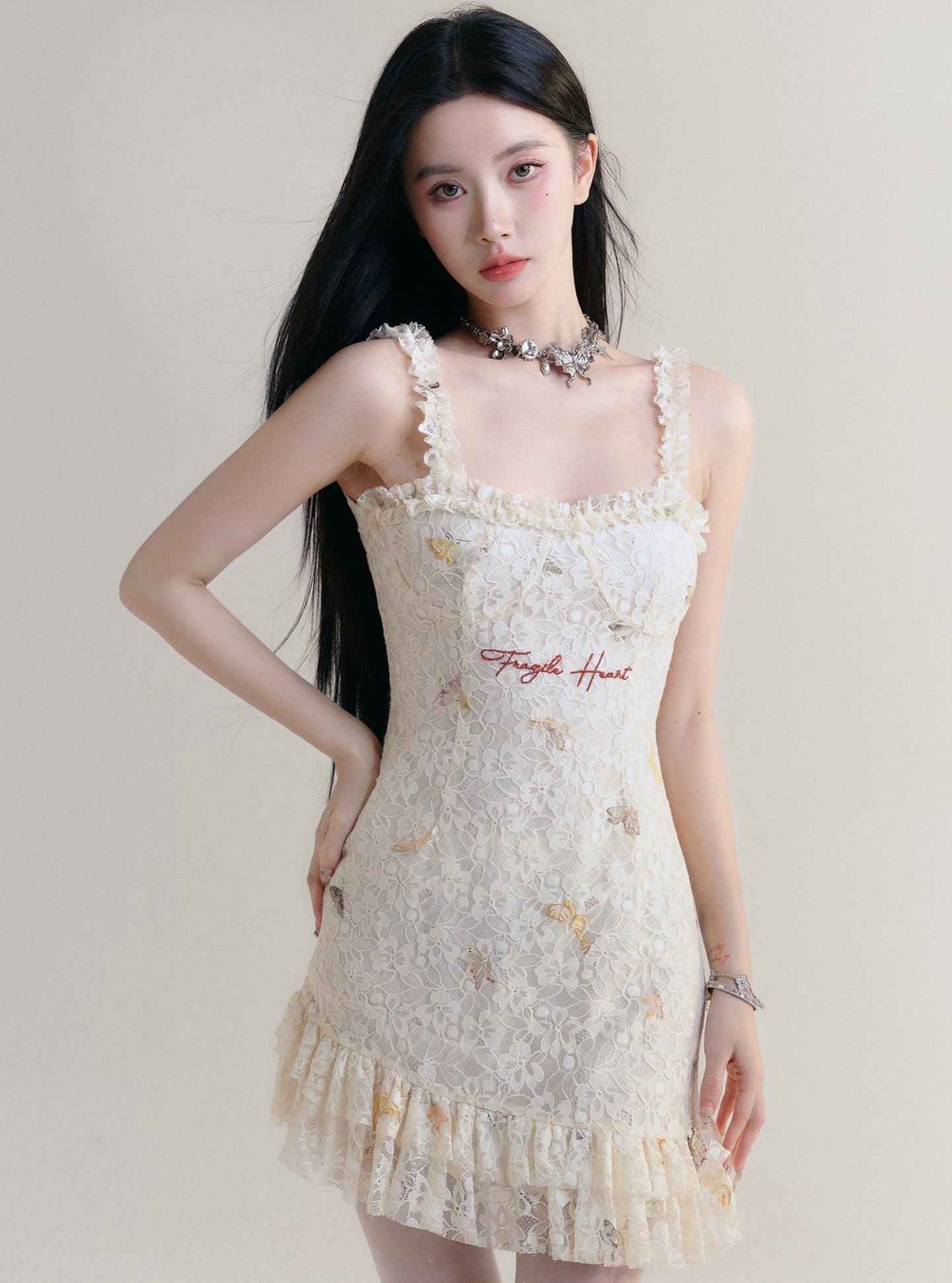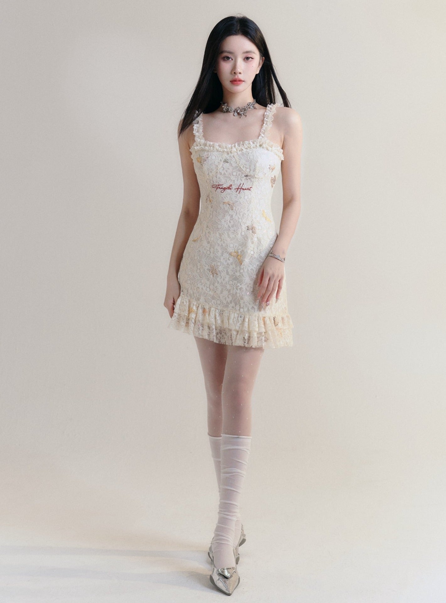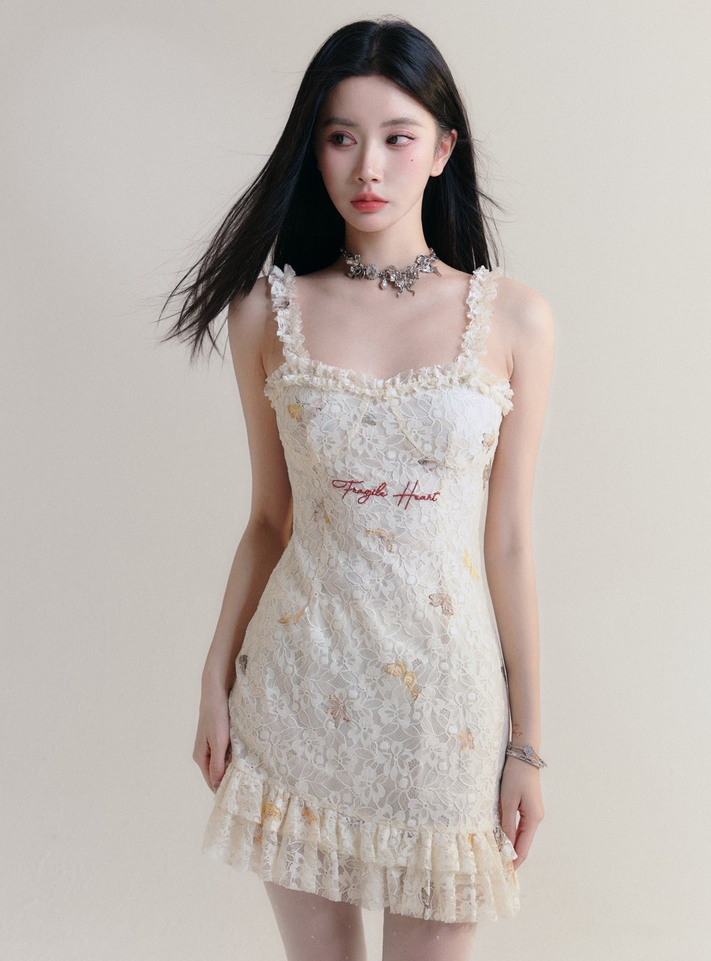 Vintage-Inspired Floral Lace Mini Dress with Ruffle Trim