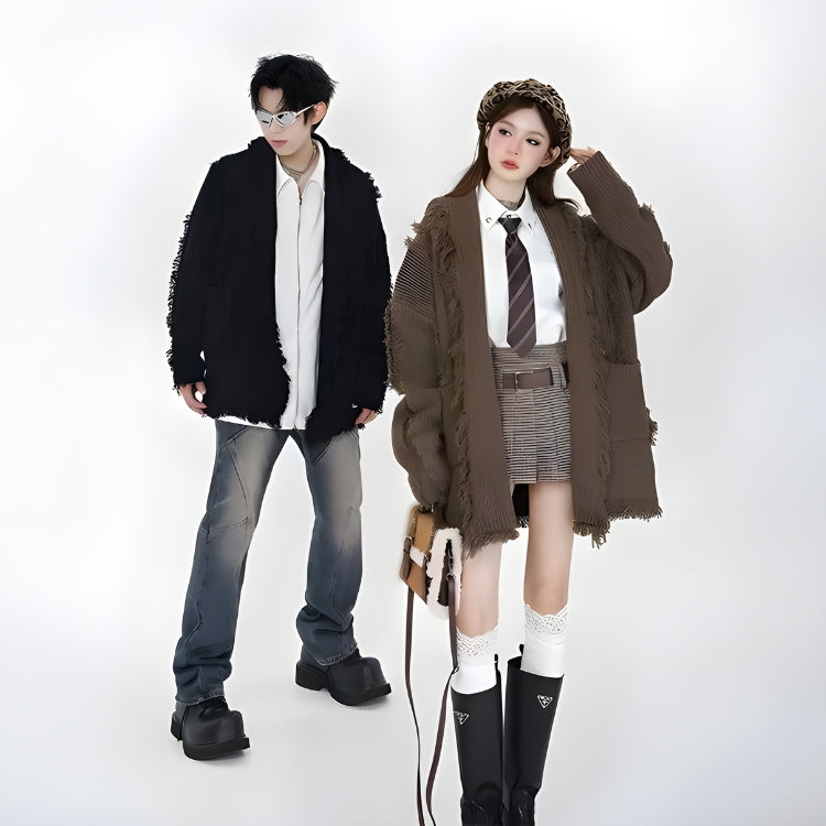 This unisex cardigan embodies the dark academia aesthetic with its tasseled design and deep V-neck. Featuring two front pockets and a drop shoulder cut. it's ideal for winter and fall. perfect for casual wear or as a stylish college outfit.