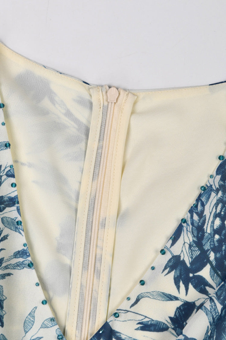Set the mood for a relaxed getaway with our vintage printed dresses at our boutique. This flowy midi exotic printed dress features green beads elegantly highlight the V neckline and V-shaped waistline for a touch of sparkle. The ruched detail and long bishop sleeves create a silhouette that's both romantic and timeless. Complete with a hidden back zipper. it's the perfect outfit for women who want to feel both comfortable and captivating at beach vacations or any stylish getaway. Make a statement and embrace your femininity in this quiet luxury ensemble that blends vintage charm with modern elegance.