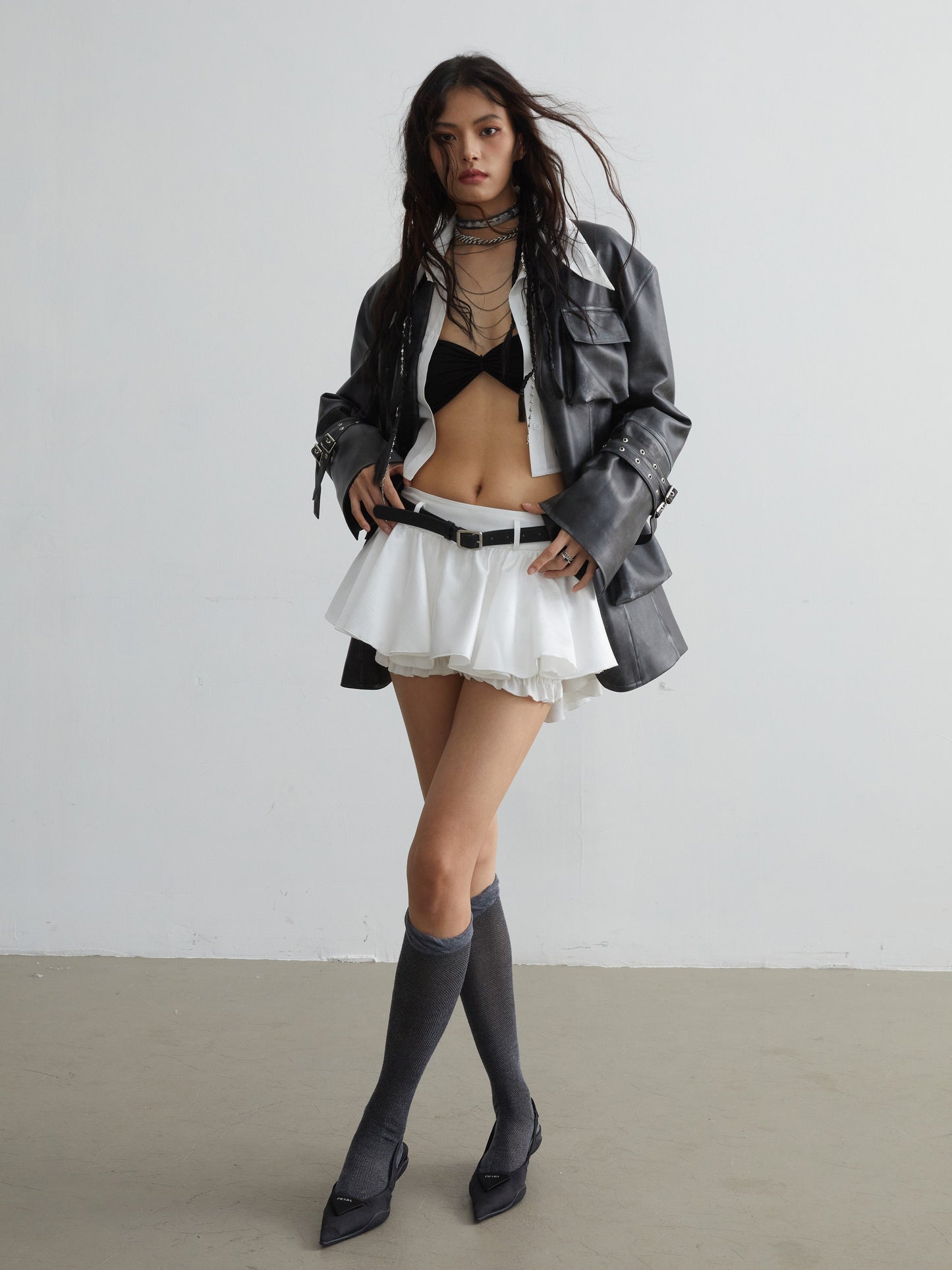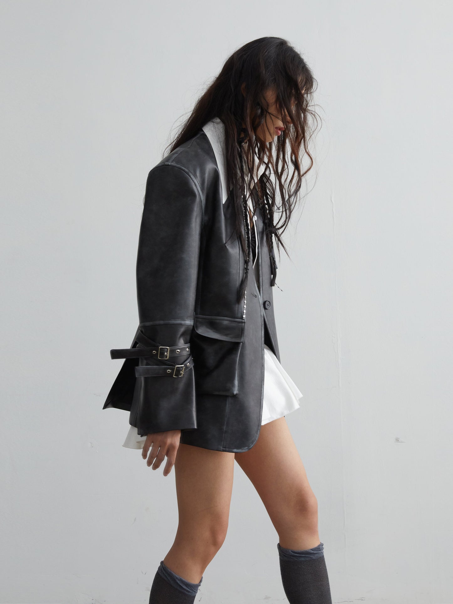Vintage Pu Leather 3D Pocket No-Collar Jacket