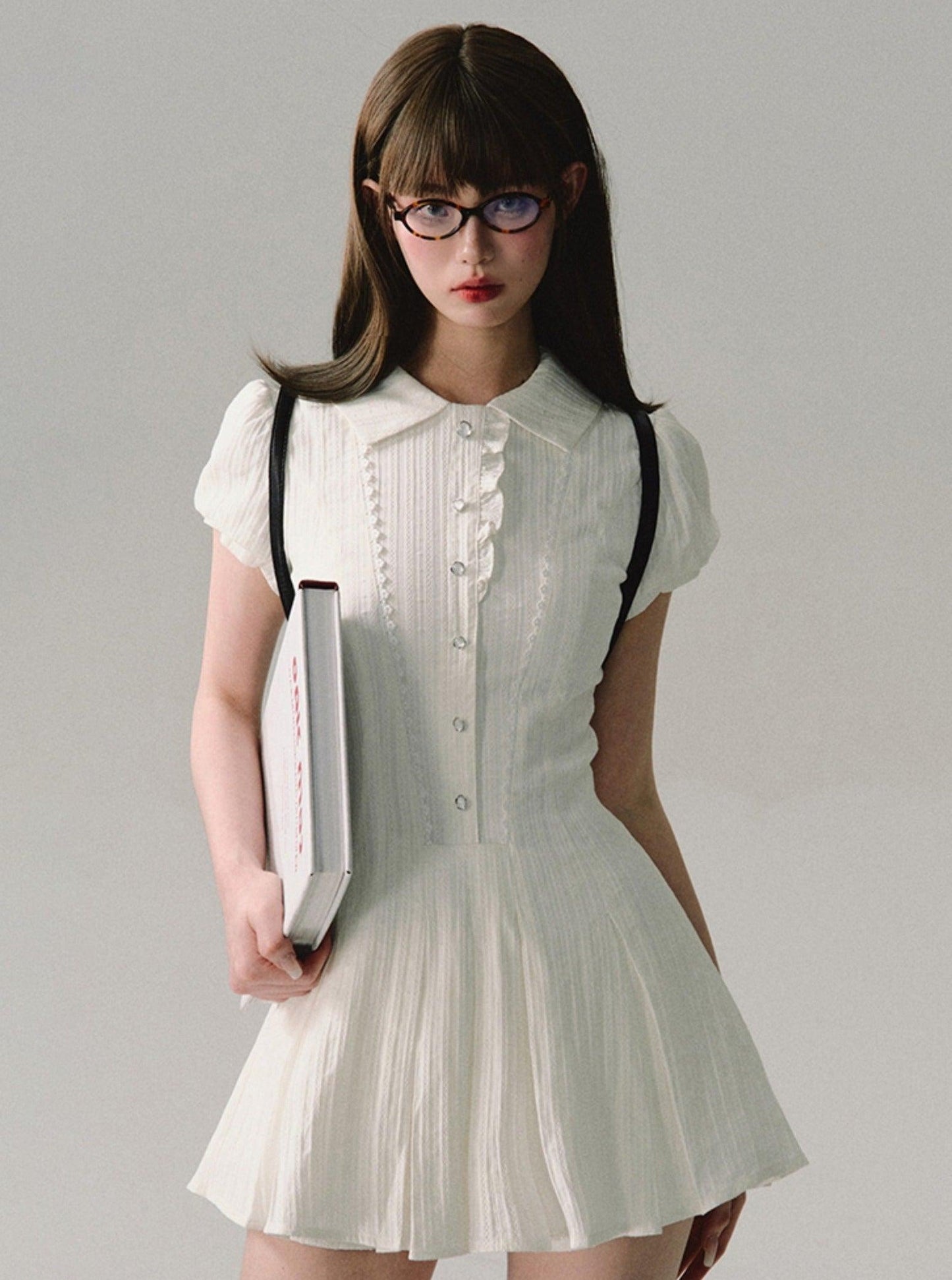 Channel a charming scholarly look with our Vintage Scholar Pleated Mini Dress. This delightful white dress combines classic elements with a modern mini length. perfect for a variety of occasions.