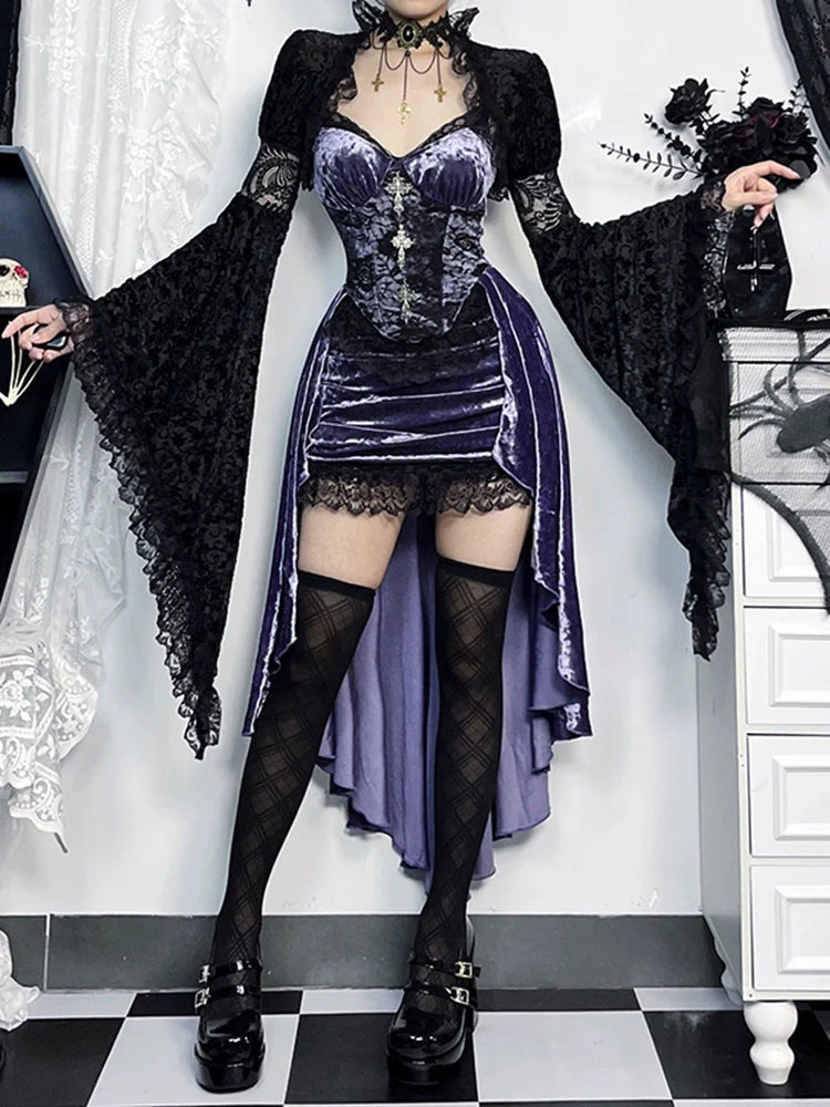 The wannathis Gothic Velvet Corset Dress Set is a stunning ensemble featuring a purple high-low gown with lace trim and a black lace bolero. This set combines the opulent texture of velvet with delicate lace details. creating a dramatic and elegant gothic look. The corset-style bodice offers a flattering fit. while the high-low hem adds a touch of modern sophistication. The black lace bolero completes the ensemble with a vintage-inspired charm. .