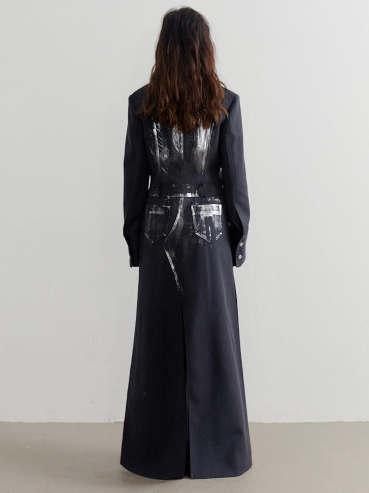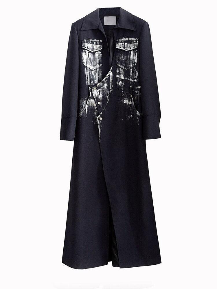 This black. one-piece wonder ingeniously combines a blazer and maxi skirt. presenting a unique take on the distressed aesthetic. With its front button fastening and an array of pockets - two on the hips. two on the chest. and an extra pair at the back. it's not just fashionable but also practical. The invisible split detail adds a surprising twist. while the cotton-polyester blend ensures comfort. Its lapel collar adds a sophisticated touch. For an edgy look. wear it as a dress or pair with bold accessories. Perfect for those who love to experiment with their style.